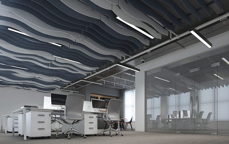 Baffles acústicos de Ecoshapes são sistemas compostos por placas acústicas instaladas no forro, na posição vertical, que além de melhorar a performance acústica, tornam o ambiente moderno.