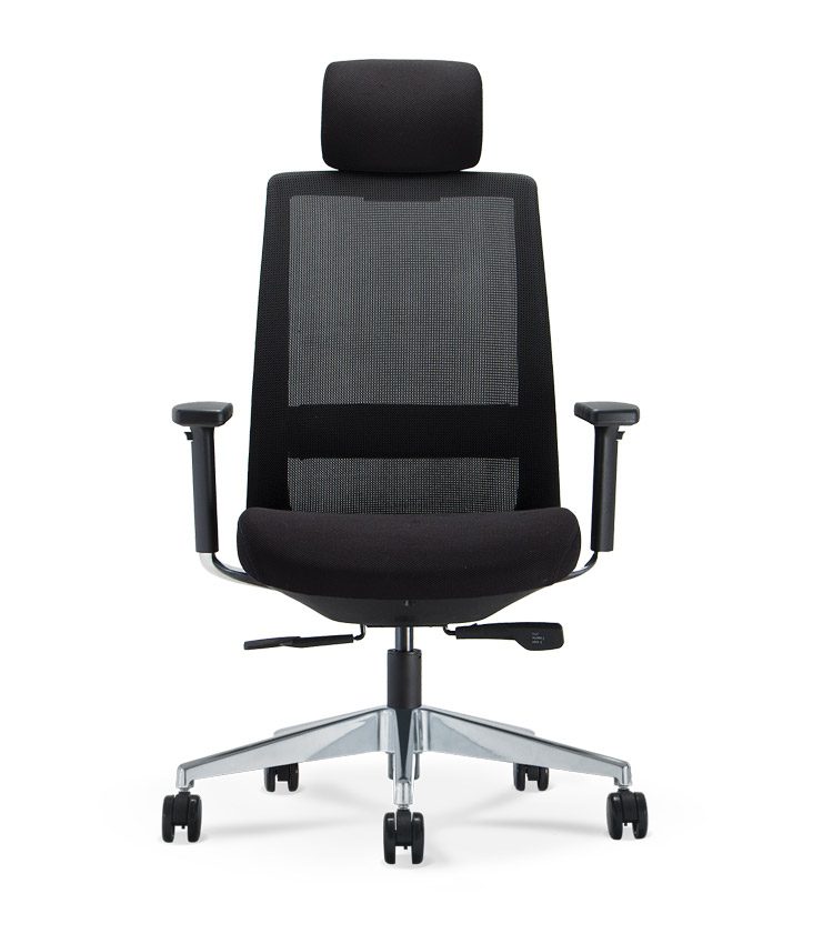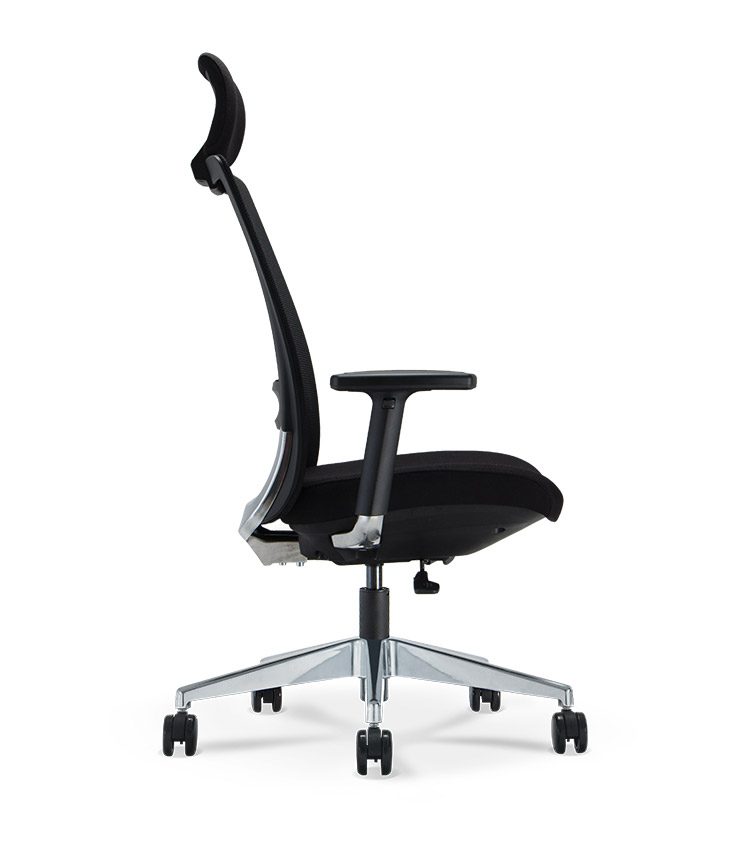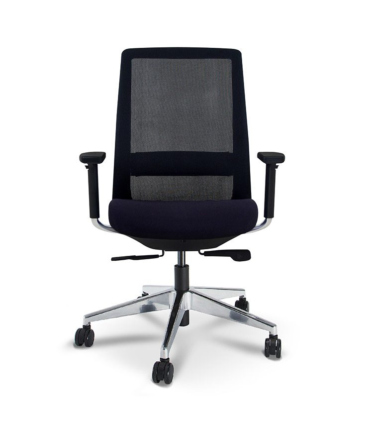 Encosto em tela, com Apoio Lombar estofado e regulável. Estrutura aparente em Alumínio Polido.