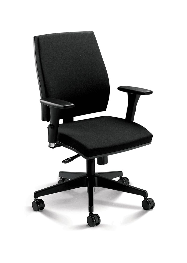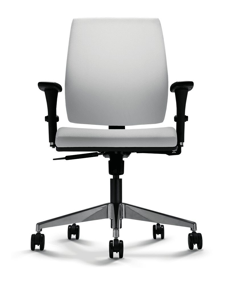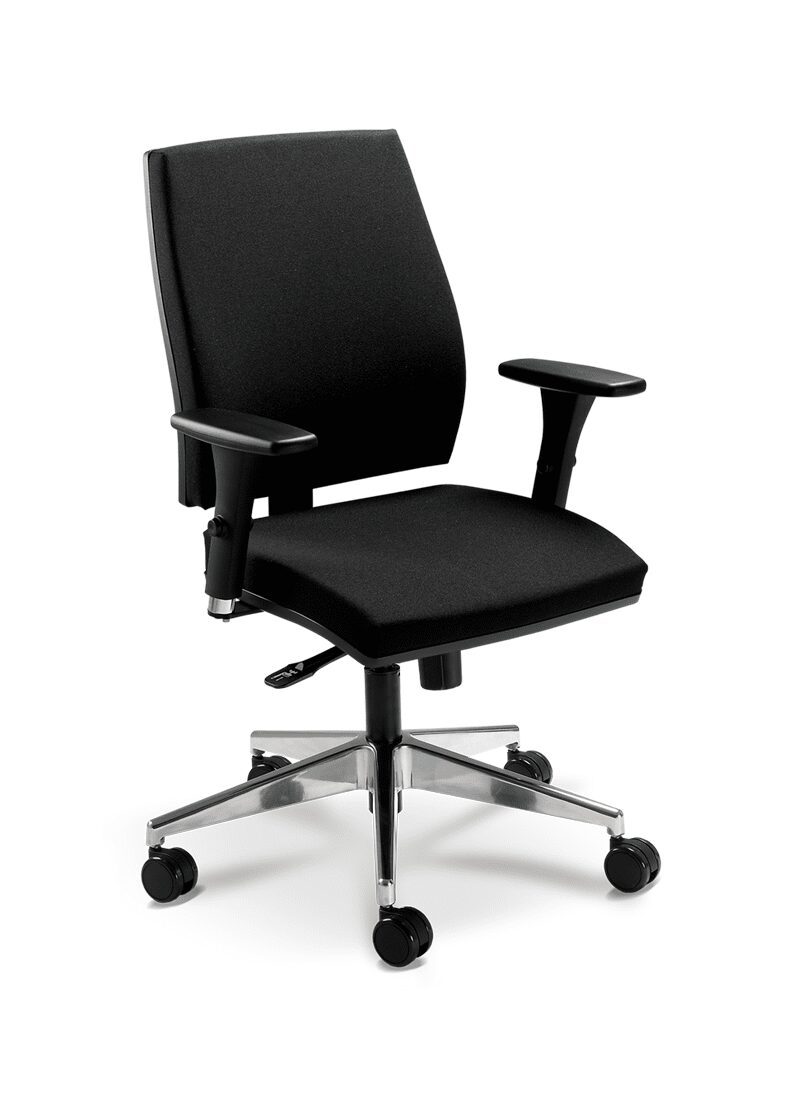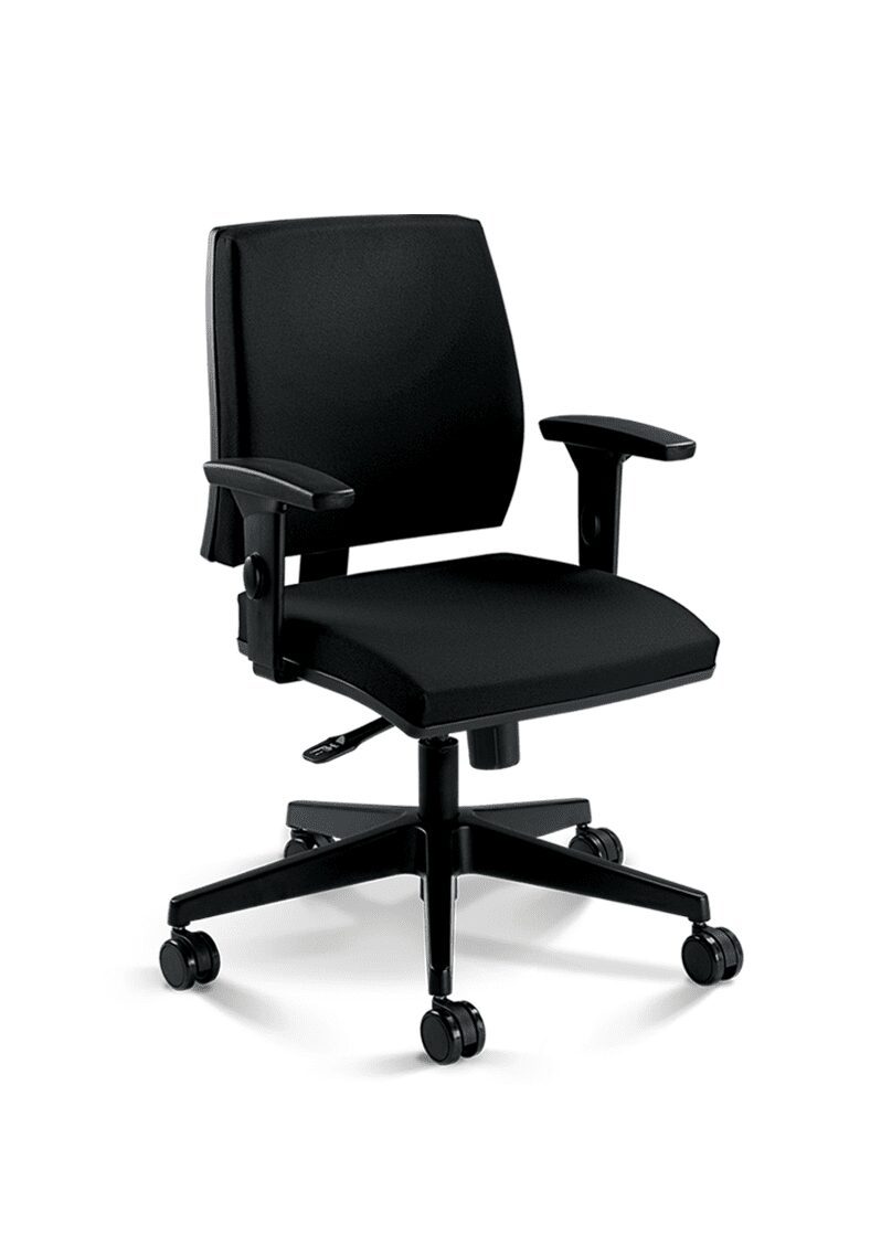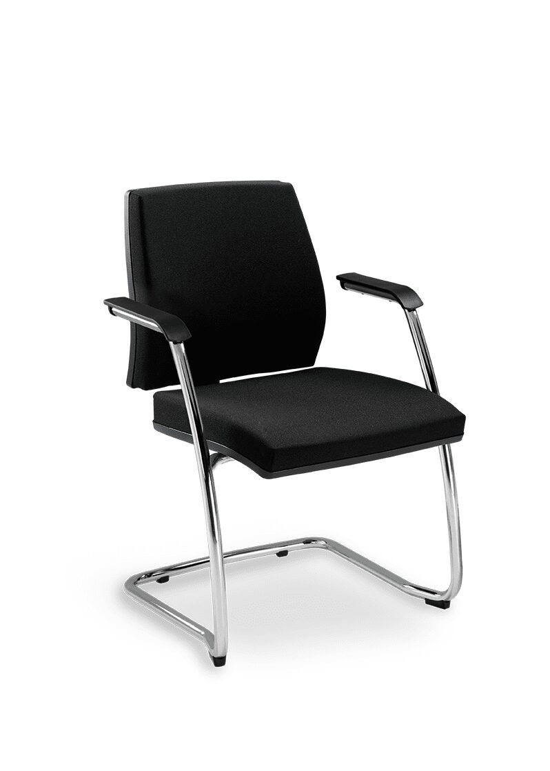 Mecanismo Syncron de 4 estágios com regulagem de tensão por manípulo frontal (com opção de regulagem de profundidade do assento). Opção de plataforma giratória para Salas de Reunião (SR).